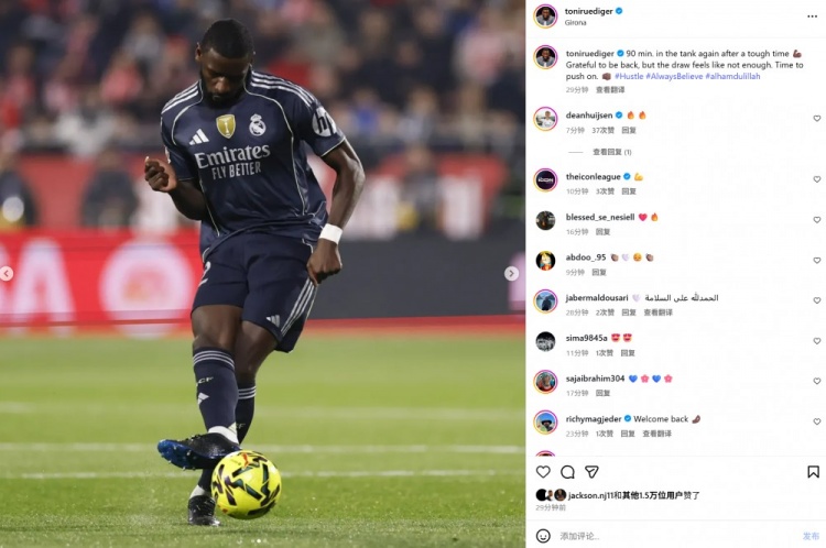 本场比赛吕迪格复出首发出场,他也在个东说念主社媒晒出本场像片,配文写说念:“在资格了一段繁难的时间后再次进行90分钟的高强度比赛💪🏾。很戴德简略回来,但平局的成果让东说念主嗅觉不够舒适。是技能延续前进了。”