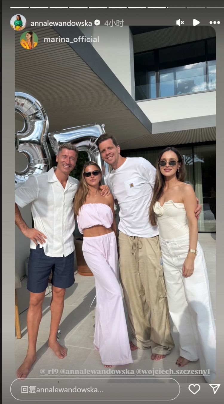 巴萨先锋莱万迎来了37岁诞辰,浑家安娜在酬酢媒体上晒配置日约聚像片和视频,祝莱万诞辰情状,什琴斯尼也进入了约聚。