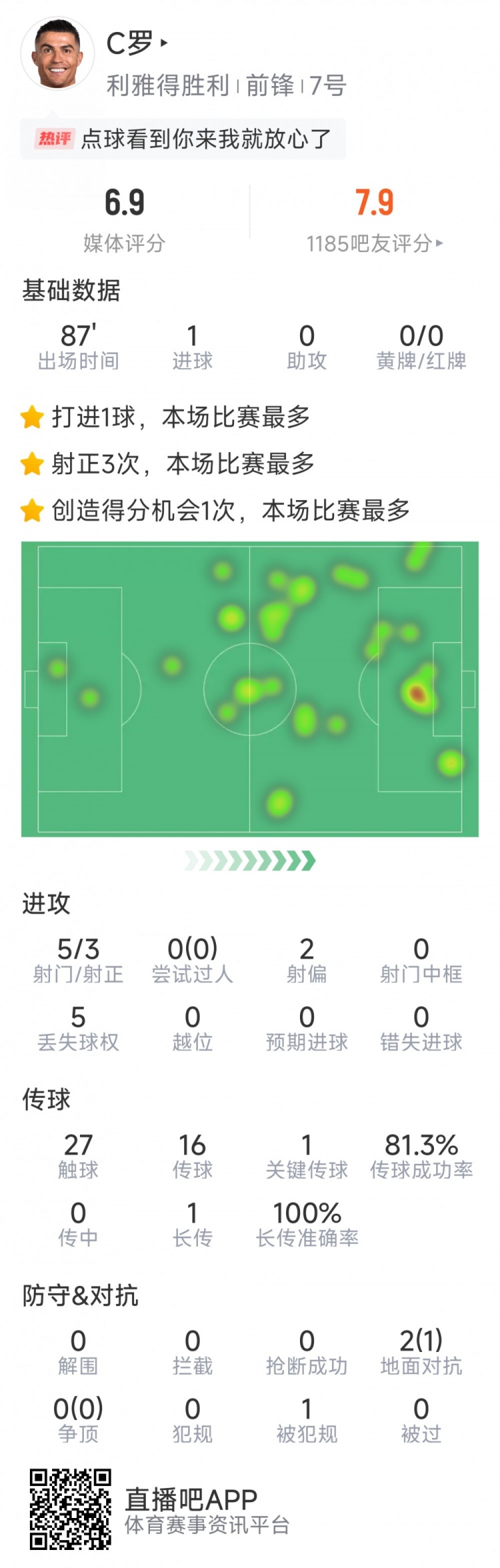 C罗本场数据:点射破门迎得手糊口百球,5射3正,1要津传球