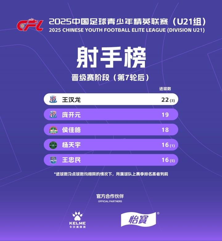 09月30日讯 2025中国足球青少年精英联赛U21组当天截止了晋级赛阶段的通盘比赛,大连英博、上海申花、长春亚泰、云南玉昆、浙江、天津津门虎、深圳新鹏城、河南8支球队参预决赛阶段,申花小将王汉龙名次弓手榜第一。
