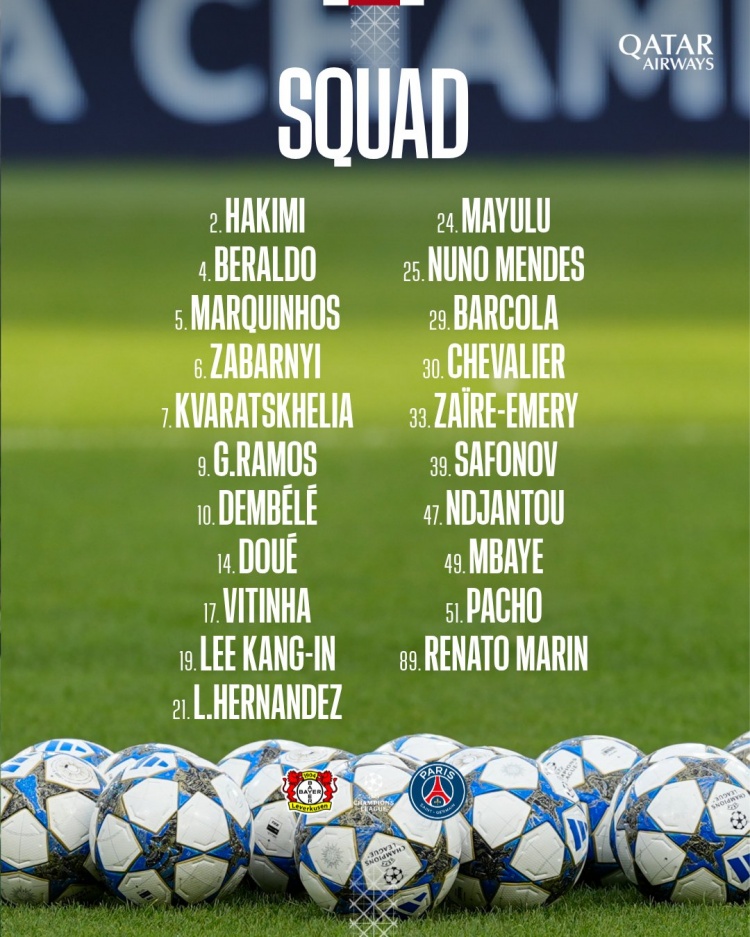 时尚:7-克瓦拉茨赫利亚、9-贡萨洛-拉莫斯、10-登贝莱、14-杜埃、19-李刚仁、29-巴尔科拉、恩贾恩图、49-姆巴耶