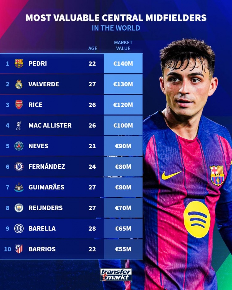 中场中路球员身价排行:佩德里1.4亿欧居首,巴尔韦德、赖斯前三