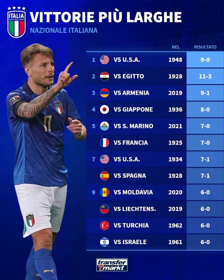 11月14日讯 北京时刻11月17日凌晨,意大利将谢世初赛终末一轮比赛中主场对阵挪威,意大利此役需要至少净胜挪威9球,才调平直出线。德国转会商场列出了意大利队史最大比分红功榜单。