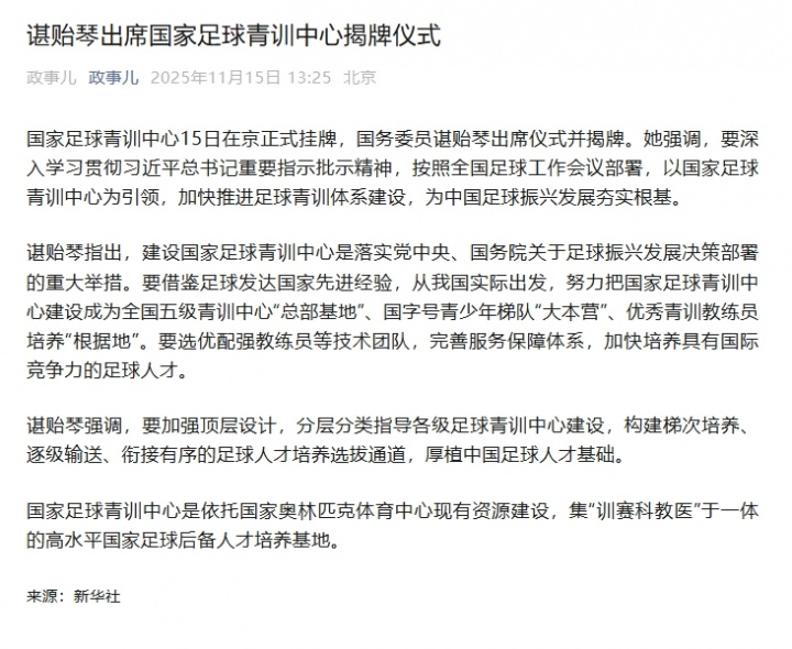 国度足球青训中心15日在京融会挂牌,国务委员谌贻琴出席典礼并揭牌。她强调,要真切学习贯彻习近平总通知要紧带领批示精神,按照天下足球使命会议部署,以国度足球青训中心为引颈,加速激动足球青训体系诱骗,为中国足球振兴发展夯实根基。