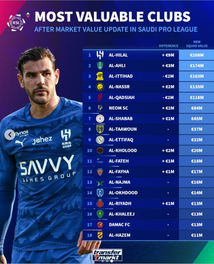 直播吧3月30日讯德国转会市场公布了最新一期的沙特联身价情况,在俱乐部身价方面,利雅得新月以2.08亿欧居首,利雅得获胜 以1.35亿欧位居第4。
