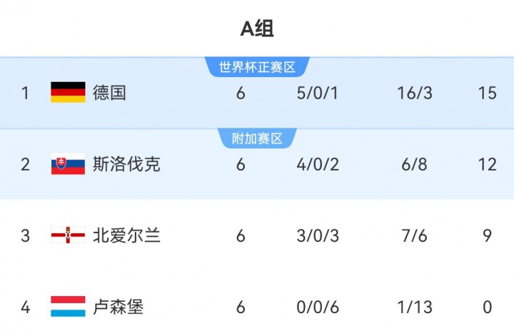 A组:德国头名纵贯正赛,斯洛伐克第2将参加附加赛,北爱尔兰凭借欧国联获利参加附加赛
