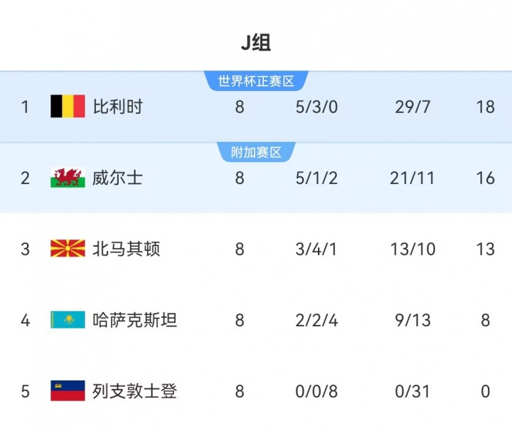 J组:比利时头名纵贯正赛,威尔士第2将参加附加赛,北马其顿凭借欧国联获利参加附加赛