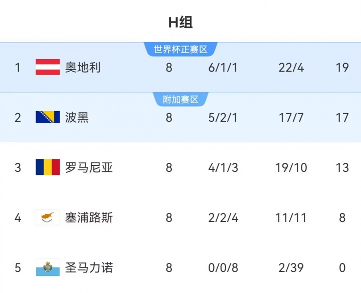 H组:奥地利头名纵贯正赛,波黑第2将参加附加赛,罗马尼亚凭借欧国联获利参加附加赛