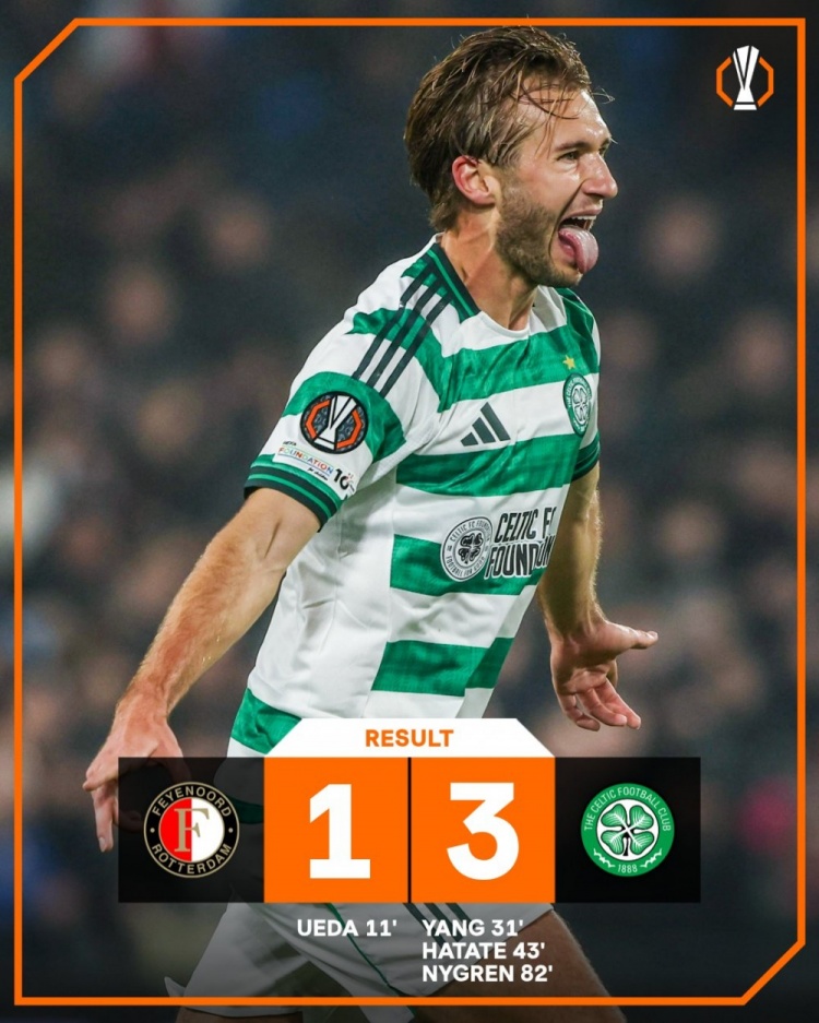 11月28日讯 欧联杯联赛阶段第5轮演出“日本德比”,最终凯尔特东谈主客场3-1打败费耶诺德。