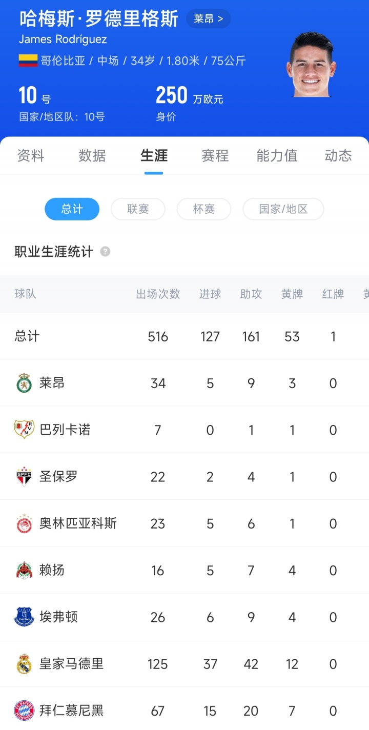 自2020年起,J罗依然蜿蜒过皇马、埃弗顿、赖扬、奥林匹亚科斯、圣保罗、巴列卡诺、莱昂7支球队。加盟莱昂后J罗共出战34场比赛,孝敬5粒进球和9次助攻。当今34岁的J罗德回身价为250万欧元。