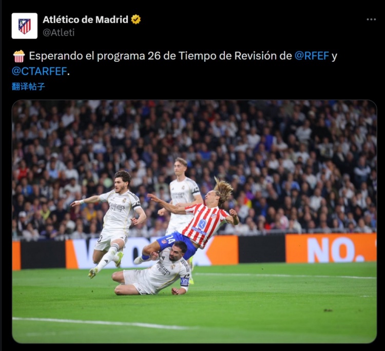 马竞对这一判决 感到不满,官方社媒晒出略伦特射球 时被铲的照片,配文:“等待西班牙足协和裁判 技术委员会的第26期裁判 评议。”