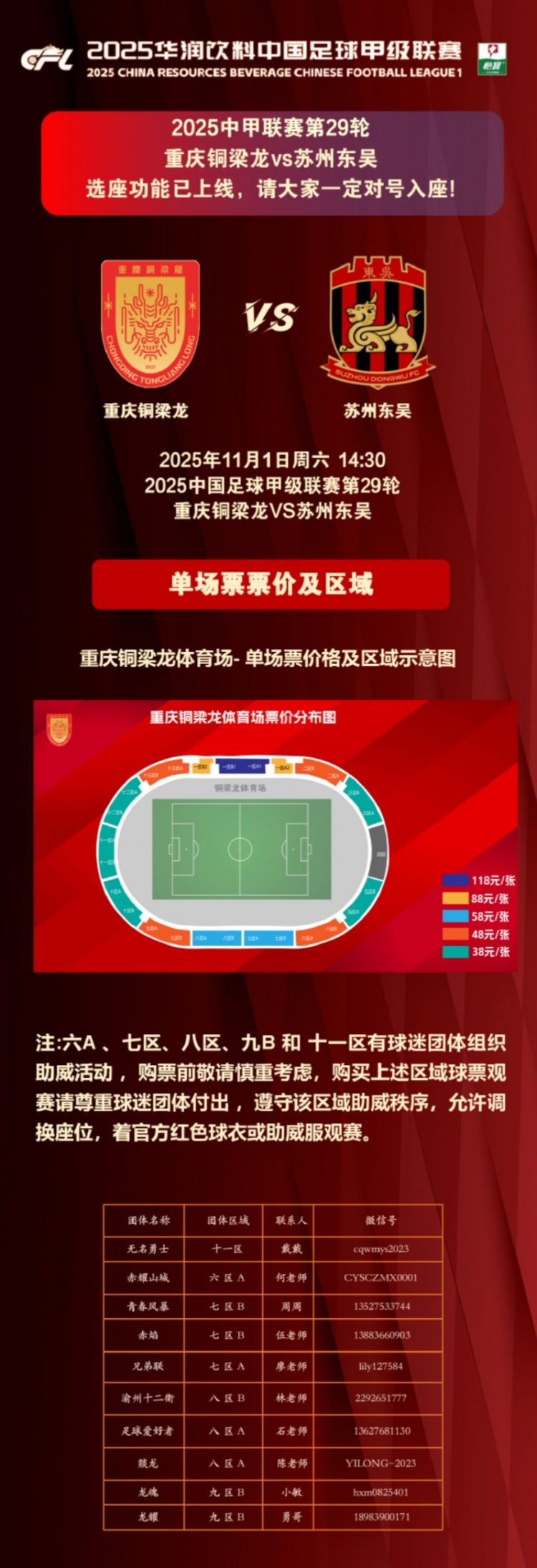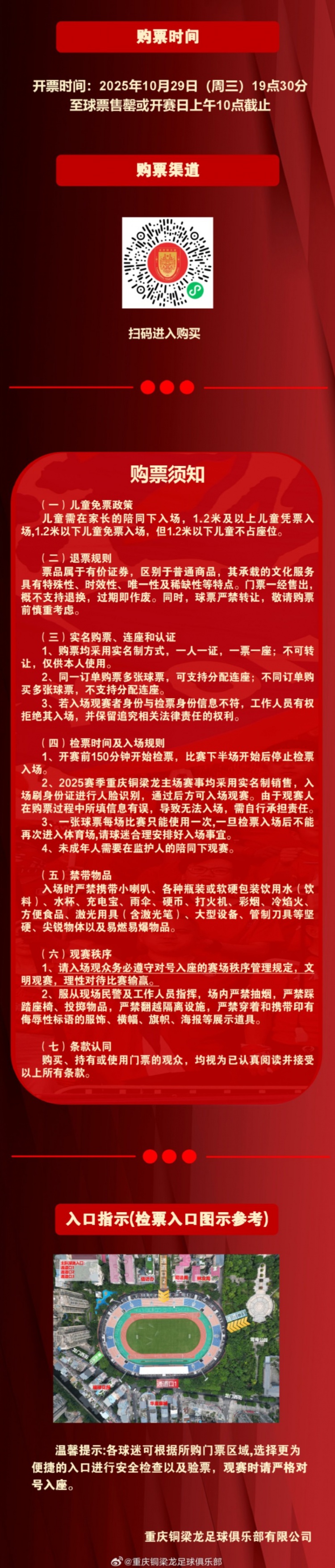 对于本次全场TIFO:请全球于比赛日今日13:30入场,听取DJ和现场职责主说念主员教导,作念好准备并支握好用于展示的TIFO物品,使用齐备后不要松驰丢弃。请尽量身着红色市欢服,营造属于重庆的看台红色之海!这面TIFO,是咱们共同的作风,这片红海,是咱们向更高舞台翻涌而去的滔滔波澜!