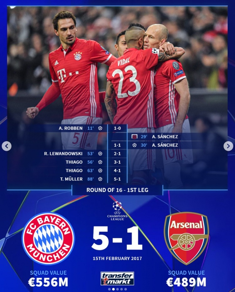 2017年2月十六强战首回合:罗本内切寰球波突破僵局,桑切斯罚丢点球被扑但补射扳平,莱万下半场匡助拜仁再次将比分超出,蒂亚戈双响,穆勒锁定胜局,最终5-1占据晋级先机。