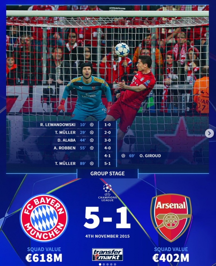 2015年11月小组赛:莱万、穆勒、阿拉巴、罗本先后立功,吉鲁为客队辅助掩面,穆勒终末技能再入一球,这亦然拜仁初次5-1打败阿森纳。