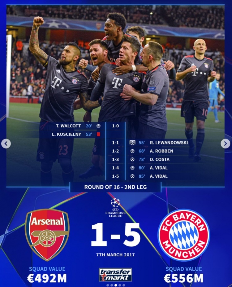 2017年3月十六强战次回合:沃尔科特首开记录,科斯切尔尼染红。莱万扳平比分,罗本、谈格拉斯·科斯塔立功,比达尔双响,拜仁再次5-1大捷。