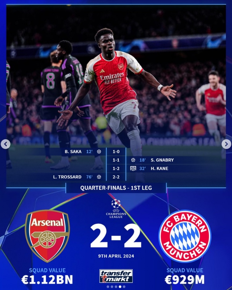 2024年4月八强战首回合:阿森纳2-2拜仁,萨卡首开记录,格纳布里攻破旧主城门、凯恩点射反超比分,特罗萨德打进扳平球。
