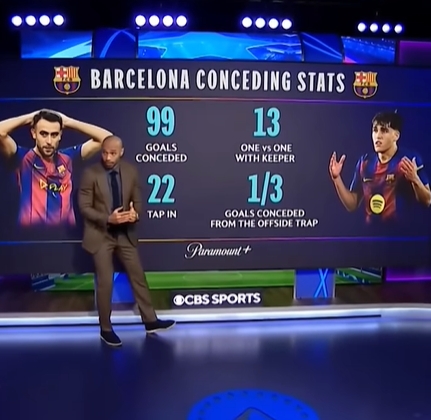 11月27日讯 亨利施展欧冠比赛时,分析了弗里克捏教巴萨后的丢球数据。