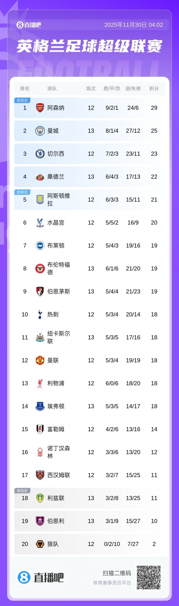 英超积分榜:曼城距榜首4分!桑德兰暂升第4,枪手明晨战切尔西