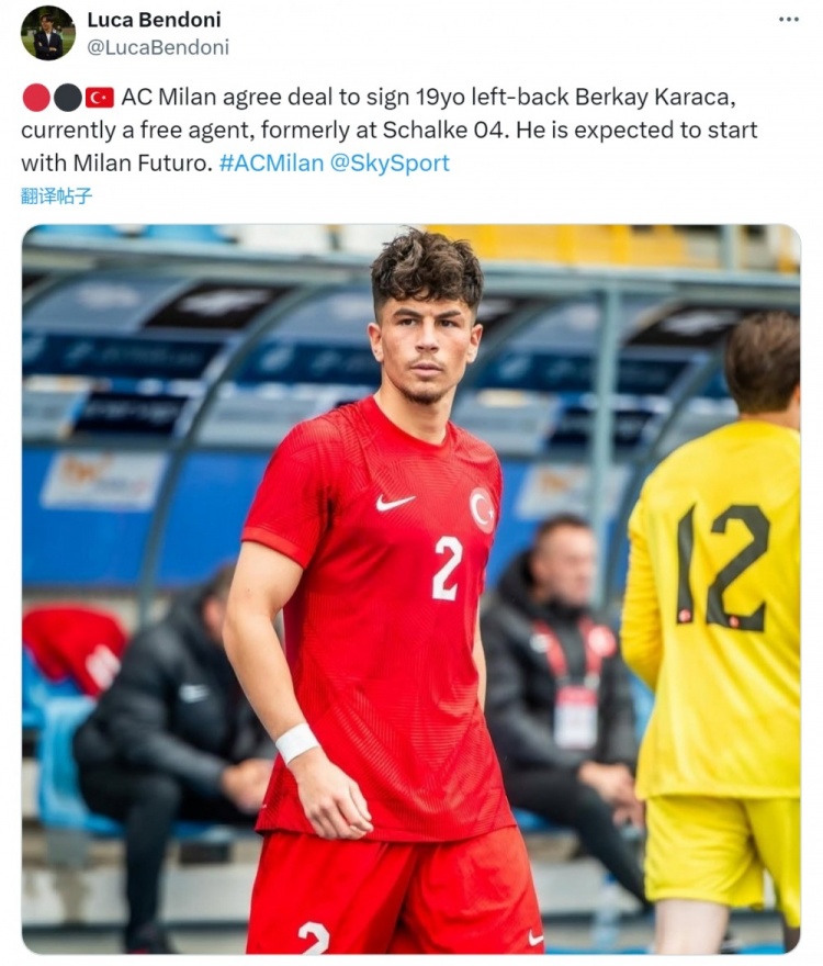 卡拉卡今夏离开沙尔克,成为摆脱球员,Luca Bendoni表示,米兰照旧与这位小勉强免签事宜完毕条约,展望他将加入米兰翌日队。