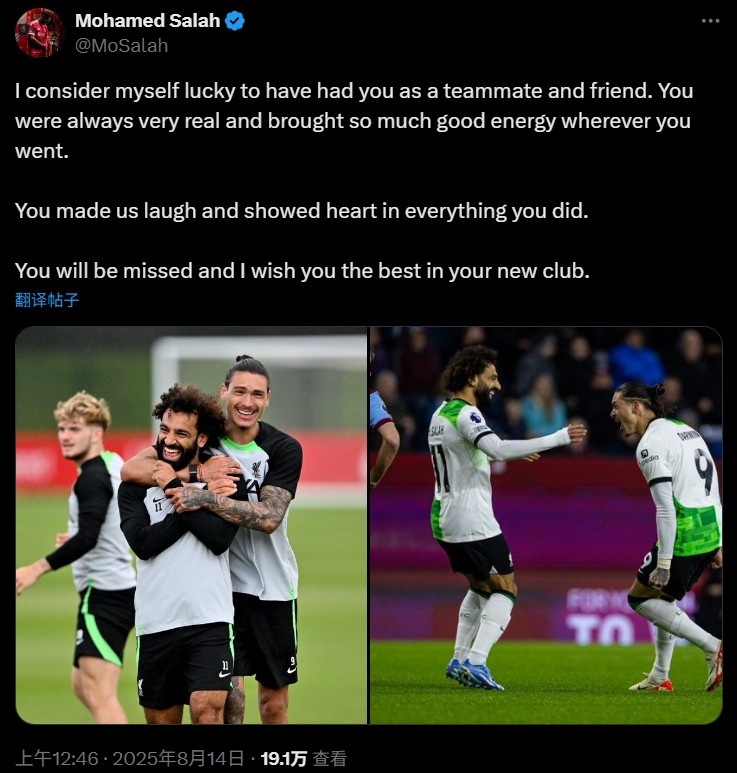 萨拉赫告别努涅斯:很交运能当你队友和一又友,祝你在新球队顺利