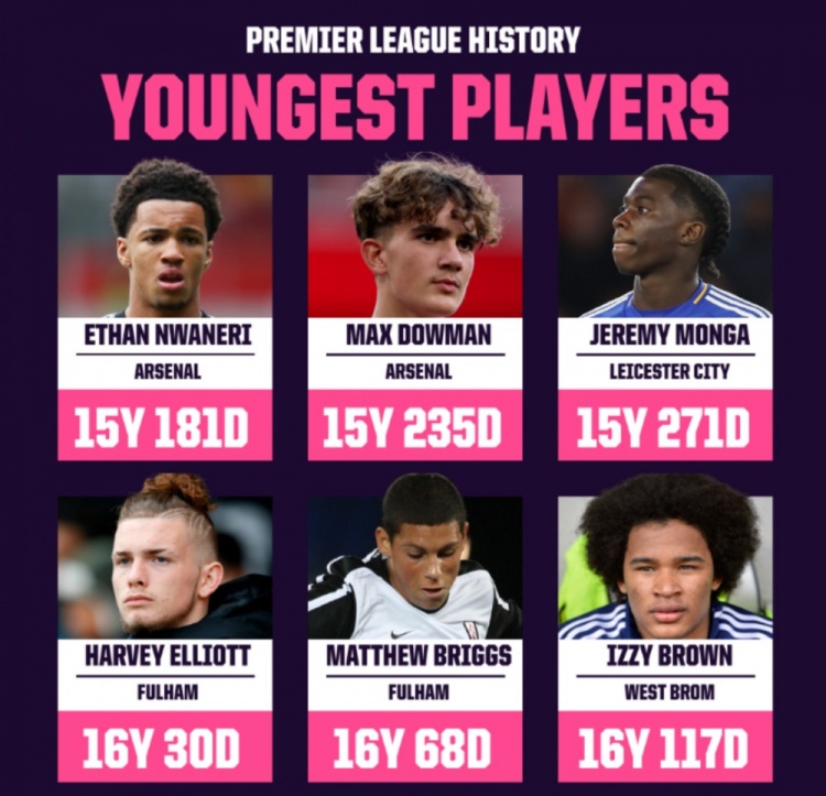 8月24日讯 英超次轮比赛,阿森纳小将谈曼为球队在英超中献技首秀。不外,在英超历史上,他献技首秀的年事仍不是最年青,尽管他只好15岁235天。