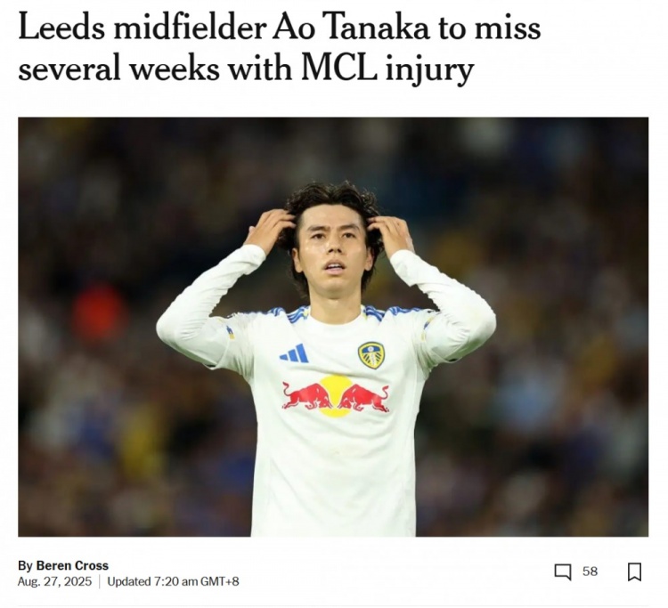 8月28日讯 TA报谈,利兹联中场田中碧因内侧副韧带受伤,将伤缺数周时间。