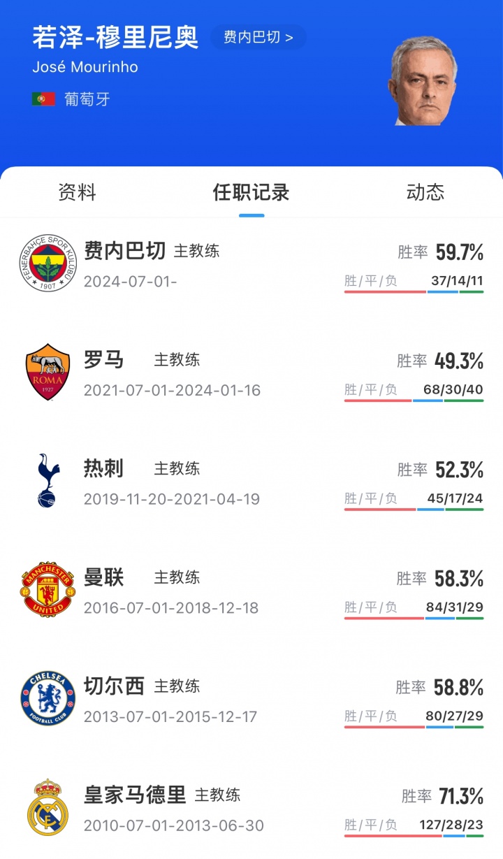 穆里尼奥2024年6月出任费内巴切主帅,带队战绩为37胜14平11负。