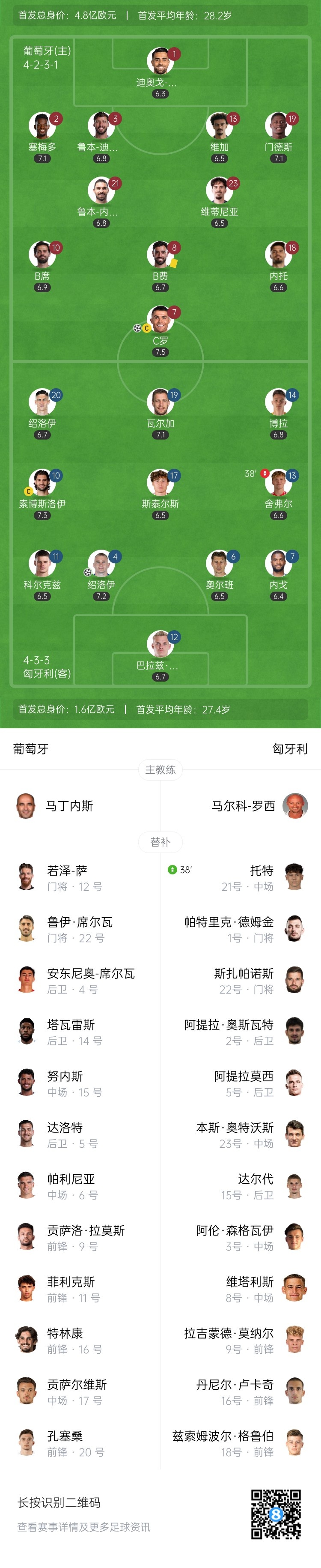 10月15日讯 世初赛欧洲区小组赛F组第4轮,葡萄牙镇守主场阿尔瓦拉德球场迎战匈牙利。上半场,绍洛伊先拔头筹,C罗双响打进个东谈主世初赛第41球独占历史弓手王。半场战罢,葡萄牙2-1匈牙利。