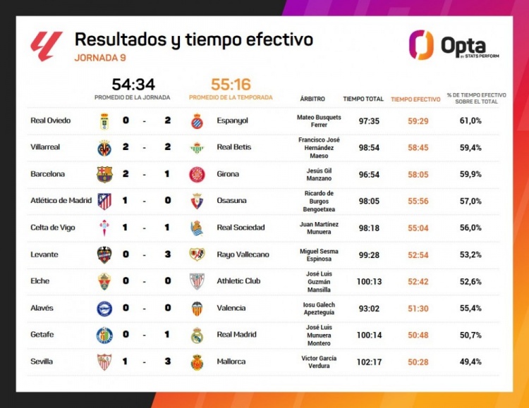 皇家奥维耶多0-2西班经纪东谈主,比赛时辰97分35秒,有用时辰59分29秒,占比61%