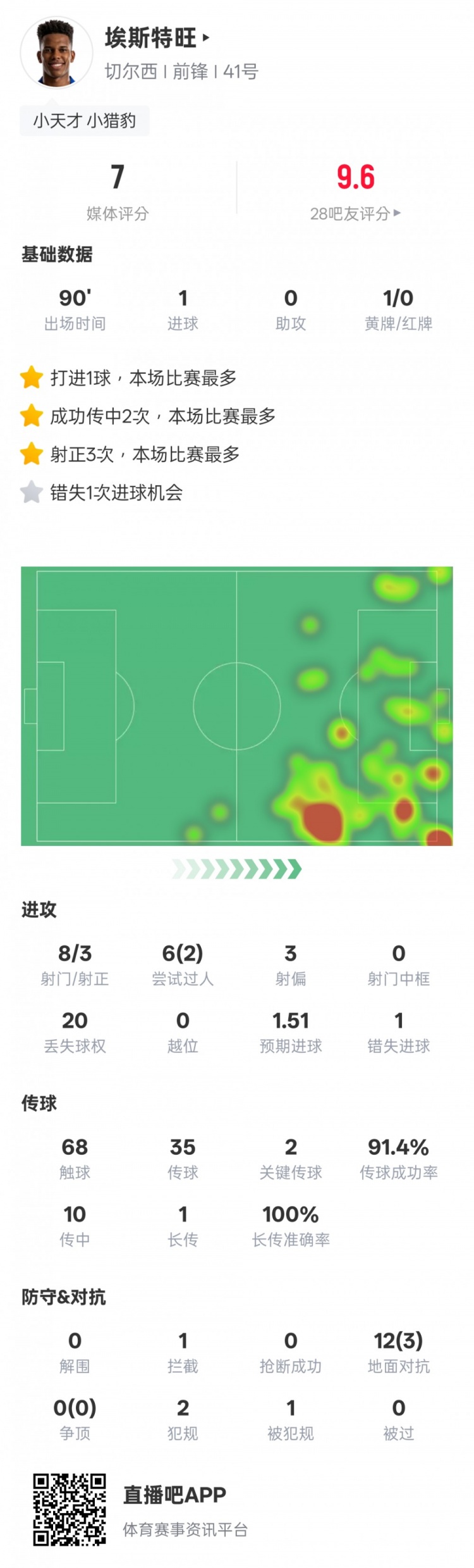 埃斯特旺本场数据:1进球2要害传球+错失1次进球契机,评分7.0