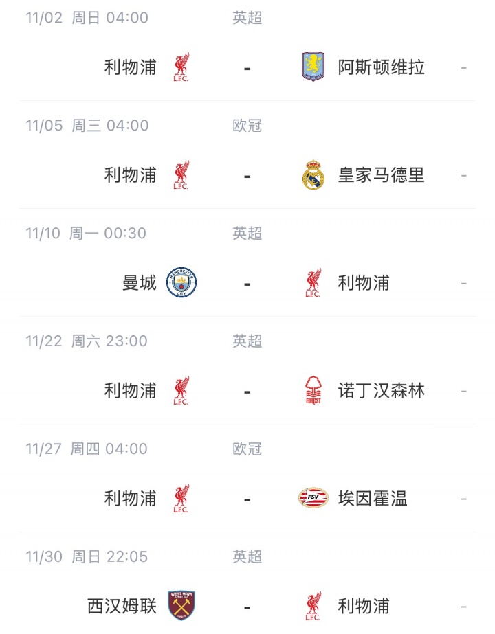 利物浦11月赛程艰辛,2号联赛迎战维拉,5号欧冠对阵皇马,随后将客战曼城。
