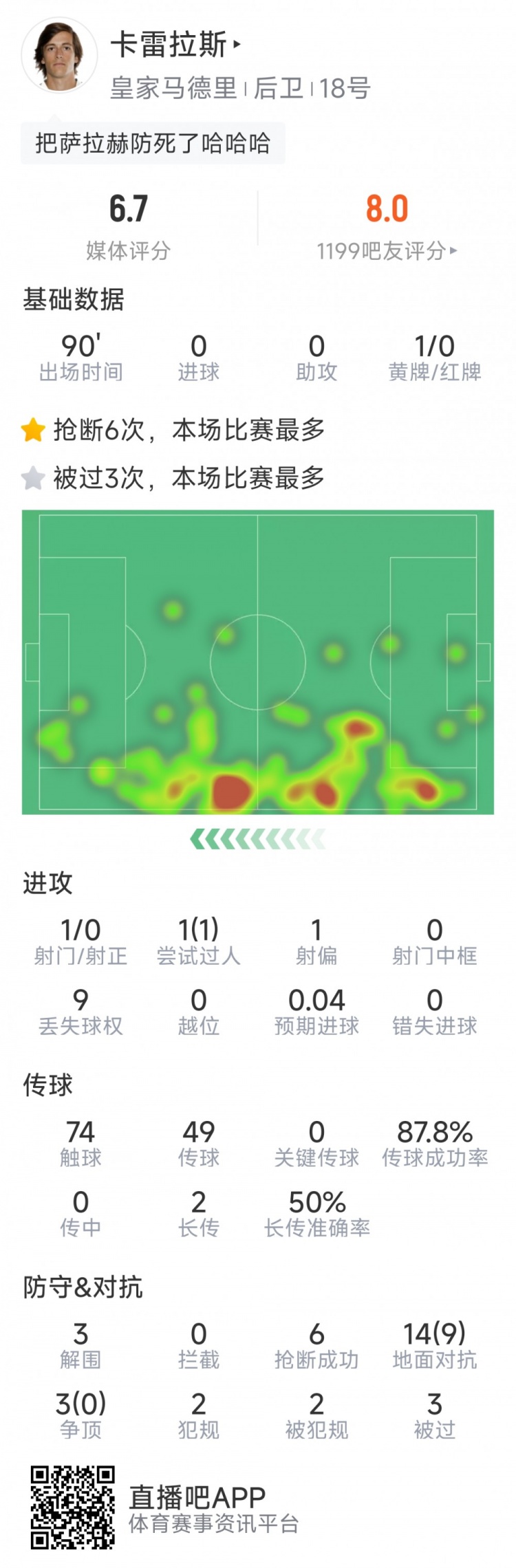 主防萨拉赫,卡雷拉斯本场数据:6次抢断,3次突围,9次告捷拒抗