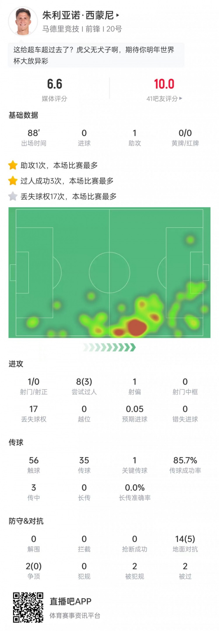 此役朱利亚诺-西蒙尼为马竞首发出战,助攻阿尔瓦雷斯破门,他当选本场比赛欧冠官方全场最好球员。