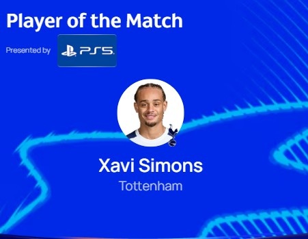 1助攻+4要害传球,官方:哈维-西蒙斯当选热刺4-0哥本哈根最好
