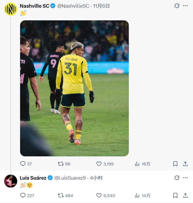 赛后苏亚雷斯辩驳了纳什维尔11月6日发的帖子。那时纳什维尔赢下比赛后,发了一个神色👋🏼