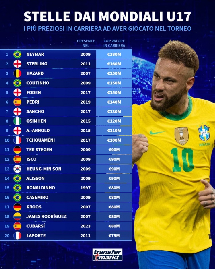 曾进入U17宇宙杯球员身价榜:内马尔1.8亿欧居首,斯特林次席